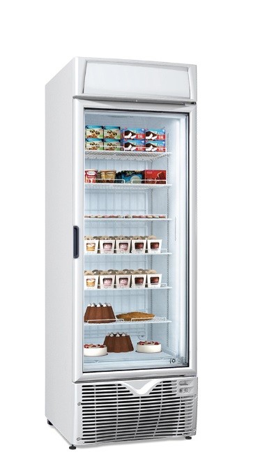 Prosklená mrazicí vitrína bílé barvy EXPO 430 NV nabízí skladovací kapacitu 403 l.