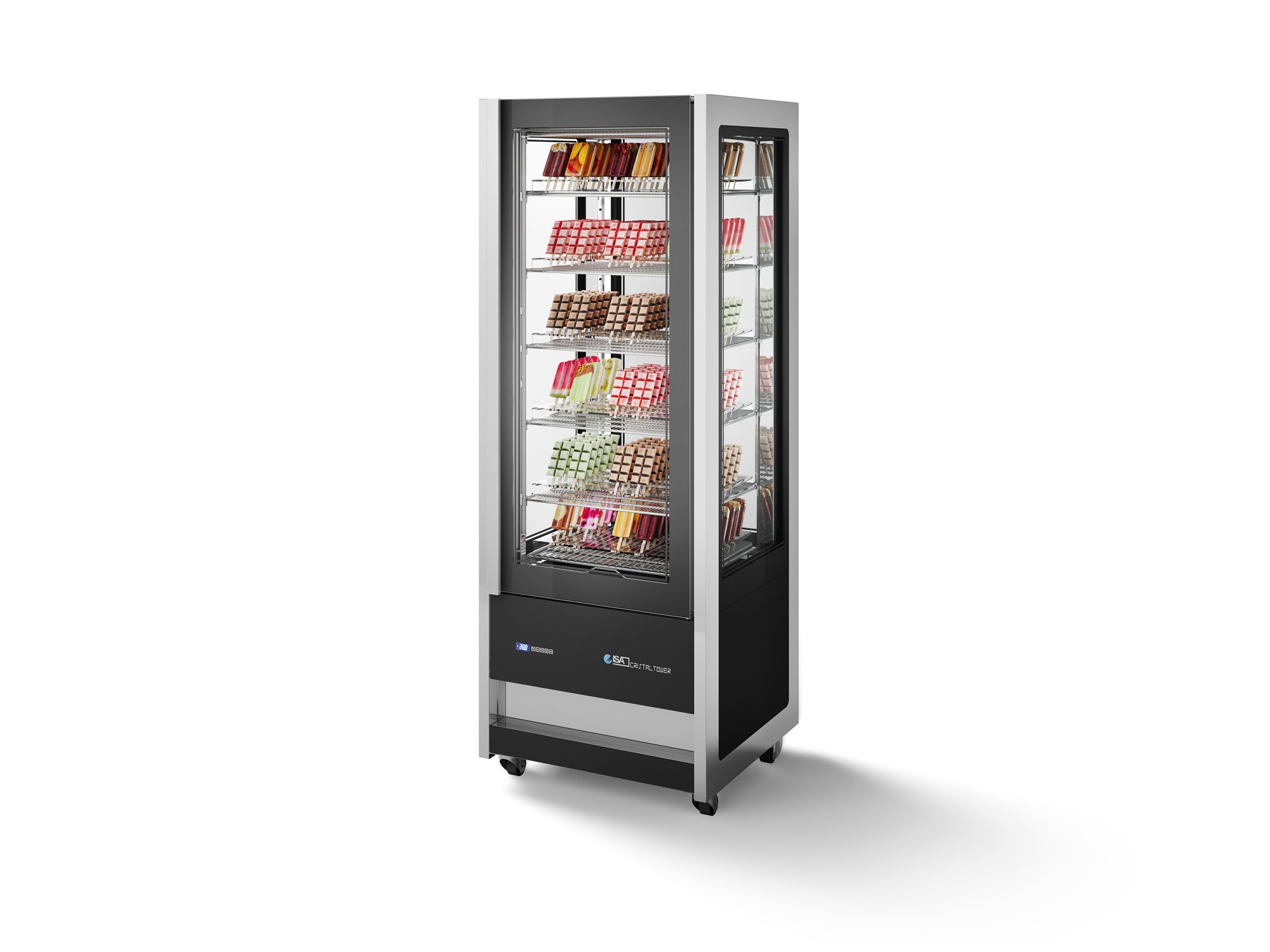 Černá vitrína v moderním designu kombinuje sklo a nerezovou ocel. Vitrína je dostupná také v bílém provedení. Vitrína je standartně vybavena 5 policemi. Skleněná výplň dveří a bočnic je vyrobena z izolačního dvojskla. Vitrína poskytuje maximální možnou viditelnost produktů, díky své celoprosklené konstrukci a využití 4 vertikálních LED trubic. Pro snadnou manipulaci je vitrína vybavena 4 plně otočnými kolečky. Dveře jsou pevné křídlové a otevírají se pomocí integrovaného nerezového madla, které vede po celé délce dveří.