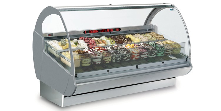 Profesionální výdejník na zmrzlinu se zaoblenou skleněnou nástvabou. Výdejník má moderní konstrukci kombinující sklo a ocel, která zaručuje bezkounkurenční výhled na vystavené výrobky. Výdejník má 4 nastavitelné nožičky, vnitřní LED osvětlení, funkci automatického odtávání, ovládací panel, digitální teploměr a protizamlžovací system. Do tohoto výdejníku jsou na výběr dvě velikosti gastronádob*: 24 x 5 l (360x165x120mm) 16 x 5 l (360x250x80mm) * Gastronádoby jsou vyrobeny z průhledného polykarbonátu.