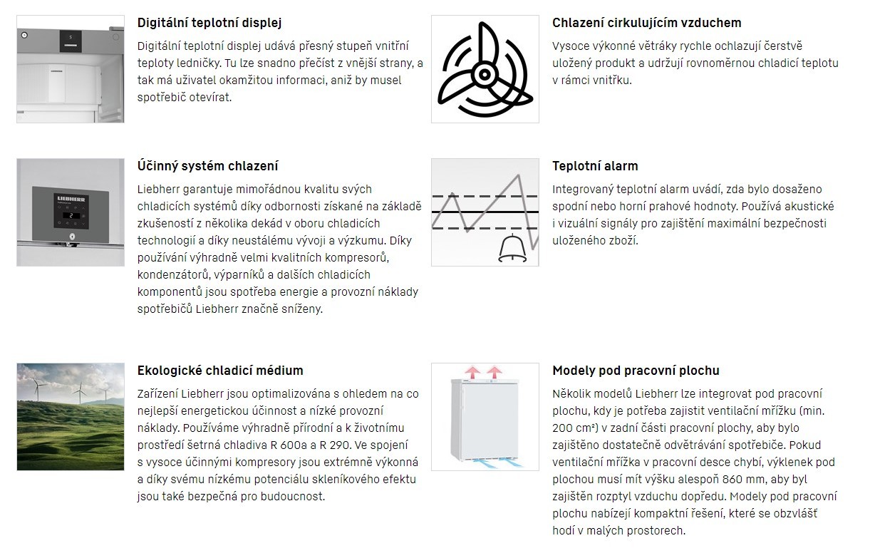 Spotřebič lze integrovat pod pracovní desku, svou výškou 83 cm je dokonale přizpůsoben specifickým pracovním výškám v gastronomii. Velmi kvalitní chladící komponent a optimalizovaná izolace zajistí nejvyšší energetickou úspornost a nízké provozní náklady. Optická a zvuková výstraha upozorňuje na nekontrolovaný narůst teploty, tepelné ztráty a na dlouho otevřené dveře. Chladnička má elektronické ovládání s velkým ukazatelem teploty-teplotu lze nastavit s přesností na jeden stupeň.