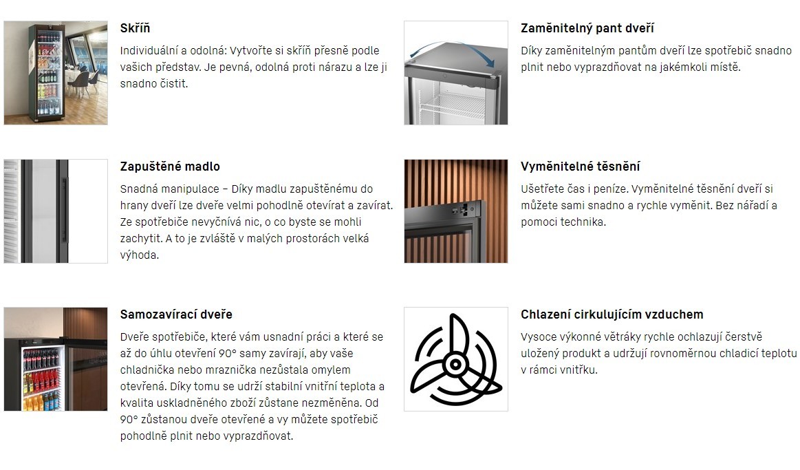 Plné dveře bez zámku se díky zaměnitelným pantům dokonale přizpůsobí místu instalace. Zapuštěný úchop zajistí snadné otevírání dveří na boční straně, je proto ideální i do velmi stísněných prostorů. Dveře se v úhlu <90° samy zavřou, aby předešlo ztrátě chladu. V úhlu od 90° zůstanou otevřeny, což zajistí snadné plnění či vyprázdnění chladničky. Vyměnitelné těsnění dveří si snadno a zcela bez nářadí dokážete vyměnit sami.
