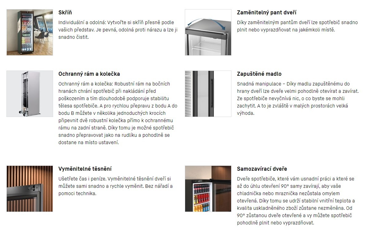 Plné dveře bez zámku se díky zaměnitelným pantům dokonale přizpůsobí místu instalace. Zapuštěný úchop zajistí snadné otevírání dveří na boční straně, je proto ideální i do velmi stísněných prostorů. Dveře se v úhlu <90° samy zavřou, aby předešlo ztrátě chladu. V úhlu od 90° zůstanou otevřeny, což zajistí snadné plnění či vyprázdnění chladničky. Vyměnitelné těsnění dveří si snadno a zcela bez nářadí dokážete vyměnit sami.