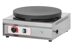 Profesionální palačinkovač v celonerezovém provedení s litinovou, smaltovanou plotnou. Plotná má průměr 350 mm. Teplotu lze snadno regulovat v rozmezí 50 / 270 °C. Palačinkovač má kontrolku chodu a vyhřátí.