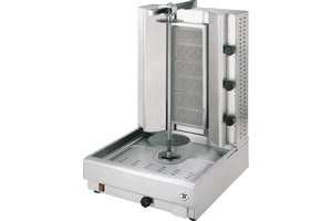 Profesionální plynový gril na gyros v celonerezovém provedení s jehlou o délce 520 mm. Motor jehly je uložen v základně přístroje mimo osu jehly. Pro zachování funkce otáčení jehly musí být přístroj zapojen do elektrické sítě! Jehlu lze naklánět a usnadnit si tak práci s pokrmem. Gril je rozdělen na tři samostatné topné sekce. Každá sekce má vlastní třístupňové ovládání. Standartně je přístroj dodáván v provedení na propan butan + nahradní tryska na zemní plyn.