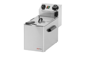 Profesionální stolní fritéza v celonerezovém provedení z nerezové oceli AISI 304. Vana má zaoblené vnitřní rohy pro snadnější čištění a údržbu. Na bocích fritézy jsou přepevněna madla pro snadnější manipulaci. Fritéza má dlouhé topné tělesa z nerezové oceli a studenou zónu, která zabraňuje přepalování oleje a zbytků potravin. Topná tělesa jsou zakryta krytem, který je chrání proti mechanickému poškození. Košík je vyroben z chromováné oceli s izolovaným držadlem a závěsným úchytem. Fritéza je vybavena pracovním a bezpečnostním temrmostatem s keramickým pláštěm. Teplotu lze regulovat v rozmezí 50 °C až 190 °C. Fritéza má kontrolku vyhřátí. Pro snadné a jednoduché čistění má fritéza odnímatelný ovládací panel s topným tělesem a vyndavací vanu.