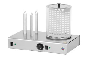 Profesionální přístroj na ohřev párků se 3 trny na ohřev rohlíků. Přístroj je v celonerezovém provedení s hliníkovými trny a skleněnou nádobkou. Přístoj má samostatné ovládání pro trny a nádobku. Trny jsou dlouhé 190 mm a 25 mm široké. Nádobka na ohřev párků má děrované dno a dělící příčku. Teplotu v nádobce lze regulovat v rozmezí 30 / 90 °C.