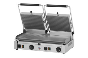 Profesionální kontaktní gril v celonerezovém provedení. Desky přístroje jsou vyrobeny z ocelové slitiny s vysokou tepelnou vodivostí. Dolní deska má kombinovanou povrchovou úpravu a horní deska rýhovanou. Přístroj je rozdělen na dvě samostatně ovládáné zóny. Teplotu grilu lze regulovat v rozmezí 50 / 300°C. Gril je vybaven kontrolkou chodu a vyhřátí, zásuvkou na odkapávající tekutiny.