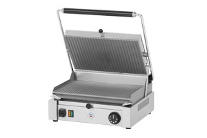 Profesionální kontaktní gril v celonerezovém provedení. Desky přístroje jsou vyrobeny z ocelové slitiny s vysokou tepelnou vodivostí. Dolní deska má rýhovanou povrchovou úpravu a horní deska rýhovanou. Teplotu grilu lze regulovat v rozmezí 50 / 300°C. Gril je vybaven kontrolkou chodu a vyhřátí a zásuvkou na odkapávající tekutiny.