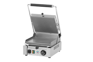 Profesionální kontaktní gril v celonerezovém provedení. Desky přístroje jsou vyrobeny z ocelové slitiny s vysokou tepelnou vodivostí. Dolní deska má hladkou povrchovou úpravu a horní deska rýhovanou. Teplotu grilu lze regulovat v rozmezí 50 / 300°C. Gril je vybaven kontrolkou chodu a vyhřátí a zásuvkou na odkapávající tekutiny.