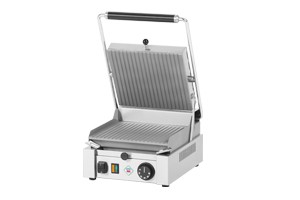 Profesionální kontaktní gril v celonerezovém provedení. Desky přístroje jsou vyrobeny z ocelové slitiny s vysokou tepelnou vodivostí. Dolní deska má rýhovanou povrchovou úpravu a horní deska rýhovanou. Teplotu grilu lze regulovat v rozmezí 50 / 300°C. Gril je vybaven kontrolkou chodu a vyhřátí a zásuvkou na odkapávající tekutiny.