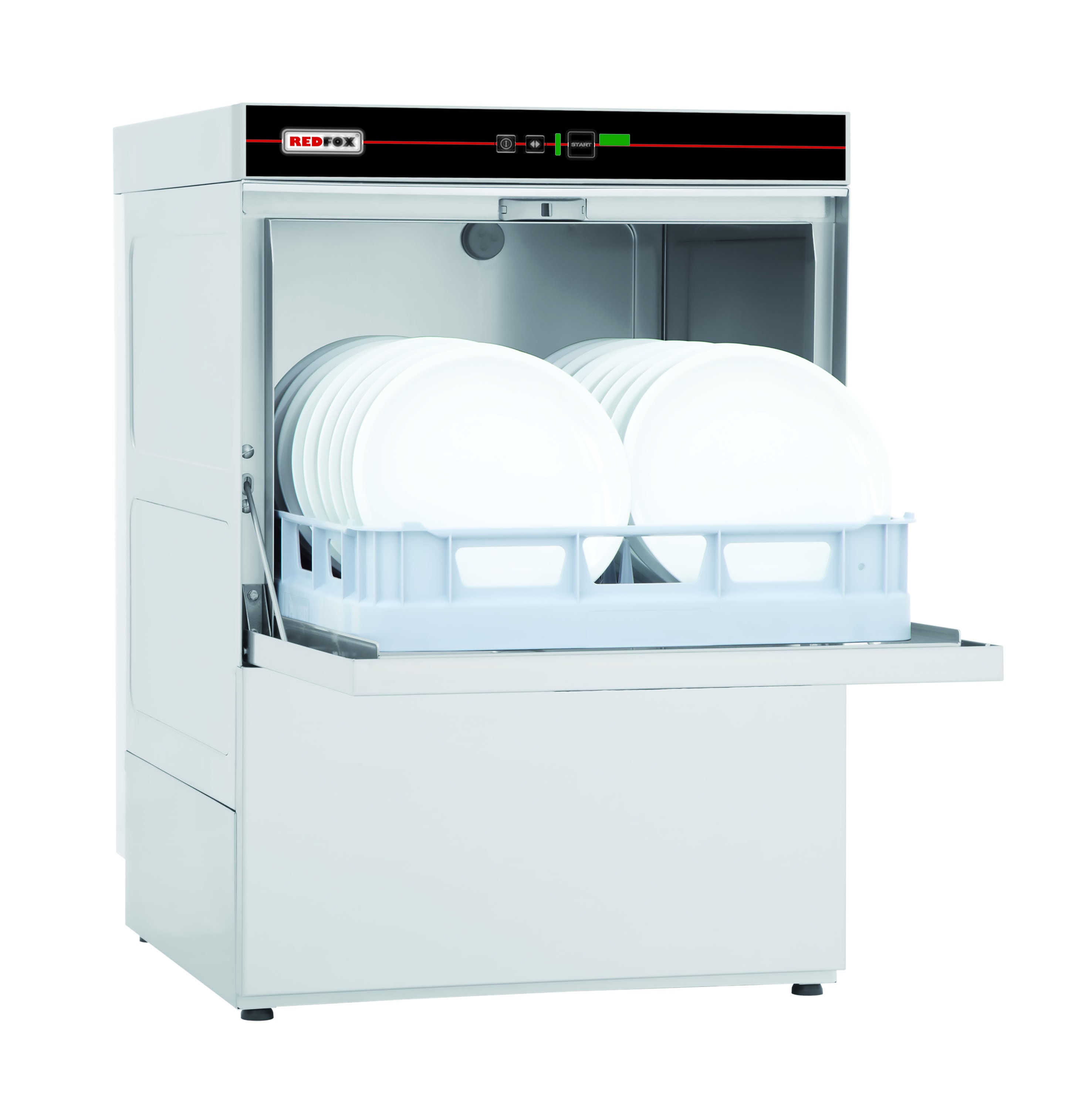 Profesionální jednoplášťová myčka nádobí v celonerezovém provedení. Mytí je uskutečňováno vodou o teplotě 60 °C, která je přes filtry čerpána do vany. Oplachová voda z bojleru o teplotě 80 °C je vytlačována tlakem přiváděné vody.Oschnutí talířů je zajištěno rozdílem teploty oplachové vody a okolního vzduchu, čímž dojde k odpaření vody z nádobí. Při mytí talířů je nutné odstranit hrubé nečistoty pomocí tlakové sprchy. Myčka je vybavena LED panelem, který je snadno ovladatelný. Jednoduchost ovládání zkracuje dobu potřebnou na vyškolení personálu a snižuje možnost omylu na minimum. Myčka je navržena pro koše o rozměrech 500x500 mm. Výška dveří je 365 mm. Délka mycího programu je 60-120-150 s a maximální kapacita je 60-30-24 košů/ h. Myčka má dávkovač mycího a oplachovacího prostředku, rotační horní a dolní ramena společná pro mytí a oplach a filtr mycí vany. Součástí dodávky je 2x koš na sklo a 1x koš na příbory.