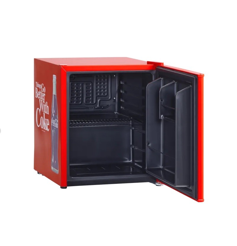 Kompaktní chladicí kostka Scandomestic Coca-cola FiftyCube o objemu 50l. Chladnička má klasický oldtimer design Coca Cola, 1 nastavitelnou polici, mechanický termostat a integrované madlo ve dveřích. Po otevření chladnička nabízí jednoduchý černý interiér. Spotřebič lze umístit do dětského pokoje či kanceláře i jako dekorační prvek.