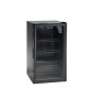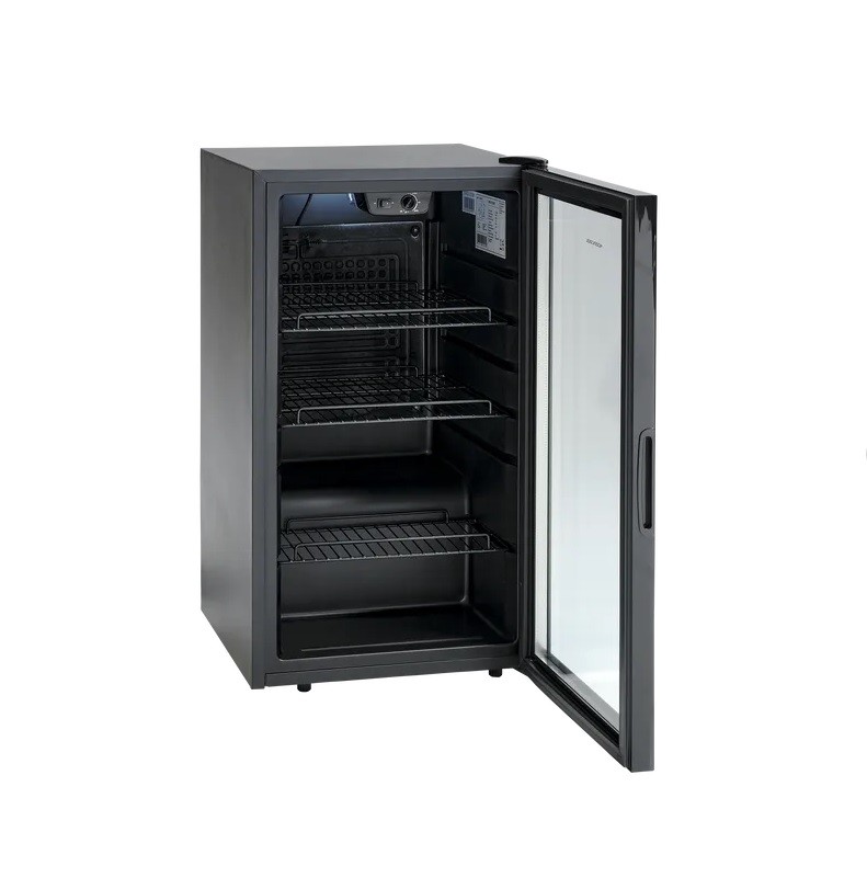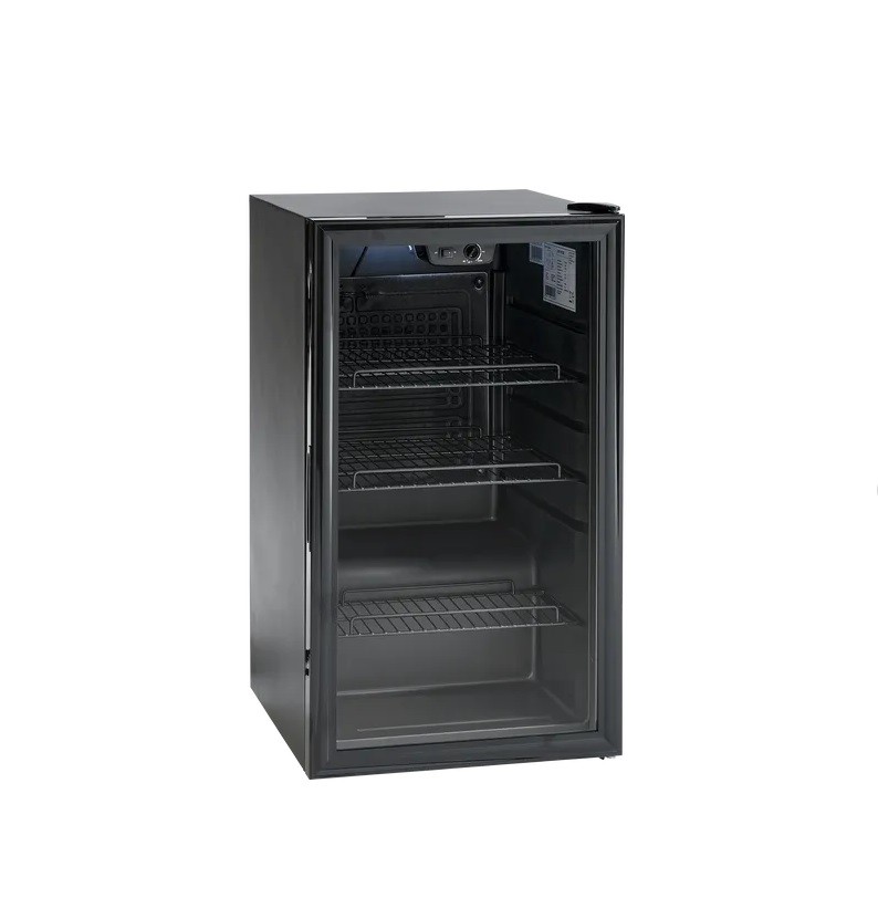 Barová prosklená chladnička Scandomestic DKS 122 BE černé barvy určená k umístění pod, nebo na barový pult s vnitřním osvětlením a objemem 110l.