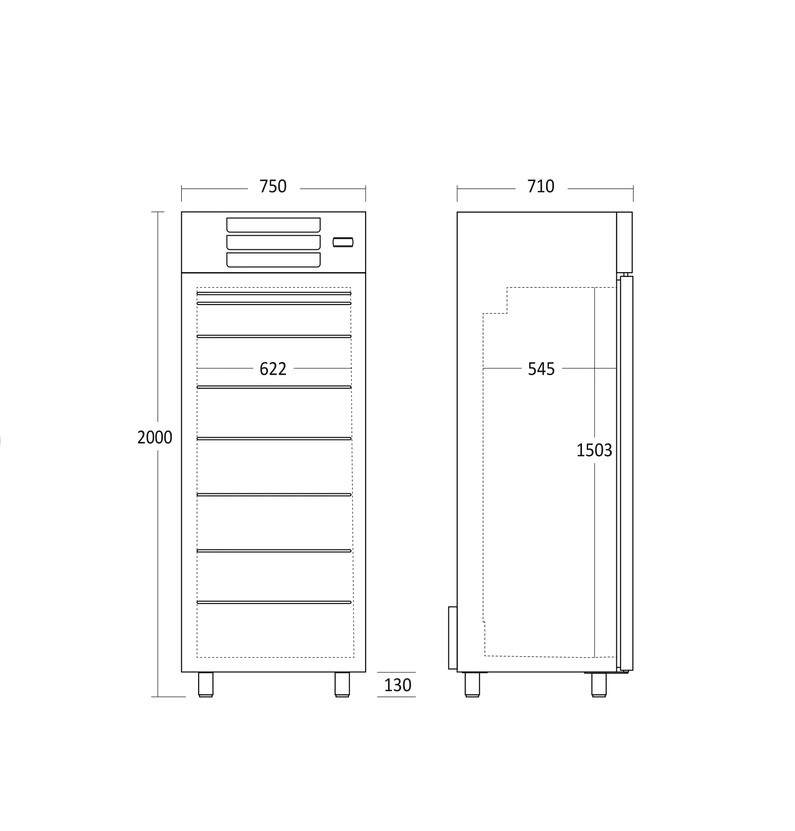 Mraznička má samozavírací křídlové dveře a čtyři výškově nastavitelné nožičky, které tak zajištují dostupnost při úklidu pod spotřebičem. Výhodou mrazničky je snadná údržba. Čtyři drátěné police pro GN 2/1. Mraznička je vybavena digitálním kontrolním panelem pro snadné ovládání. Pro svůj chod mraznička využívá oběhové chlazení s ventilátorem.