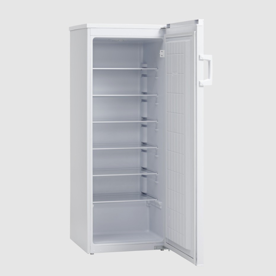 Úsporná skladovací chladnička bílé barvy o objemu 231l. Chladnička má 6 nastavitelných skleněných polic, jednoduchý mechanický termostat a 2 nastavitelné nožičky vpředu.
