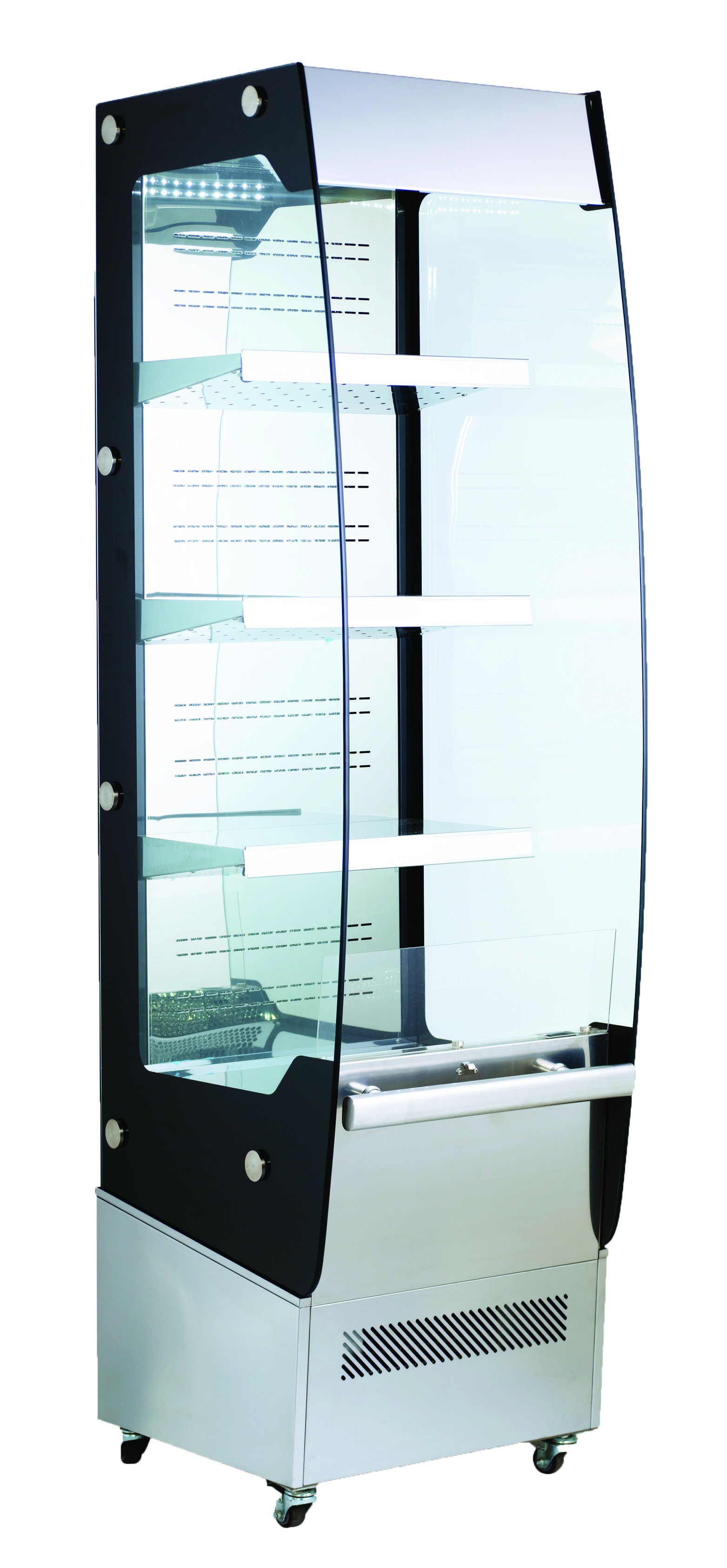 Chladnička má skleněné bočnice z 1 cm tvrzrného skla, 3 pevné police, vnitřní LED osvětlení na každé polici, elektronický termostat s LED displejem, noční roletu a 4 otočná kolečka s brzdou pro snadnou manipulaci. Typ chladiva R290a.