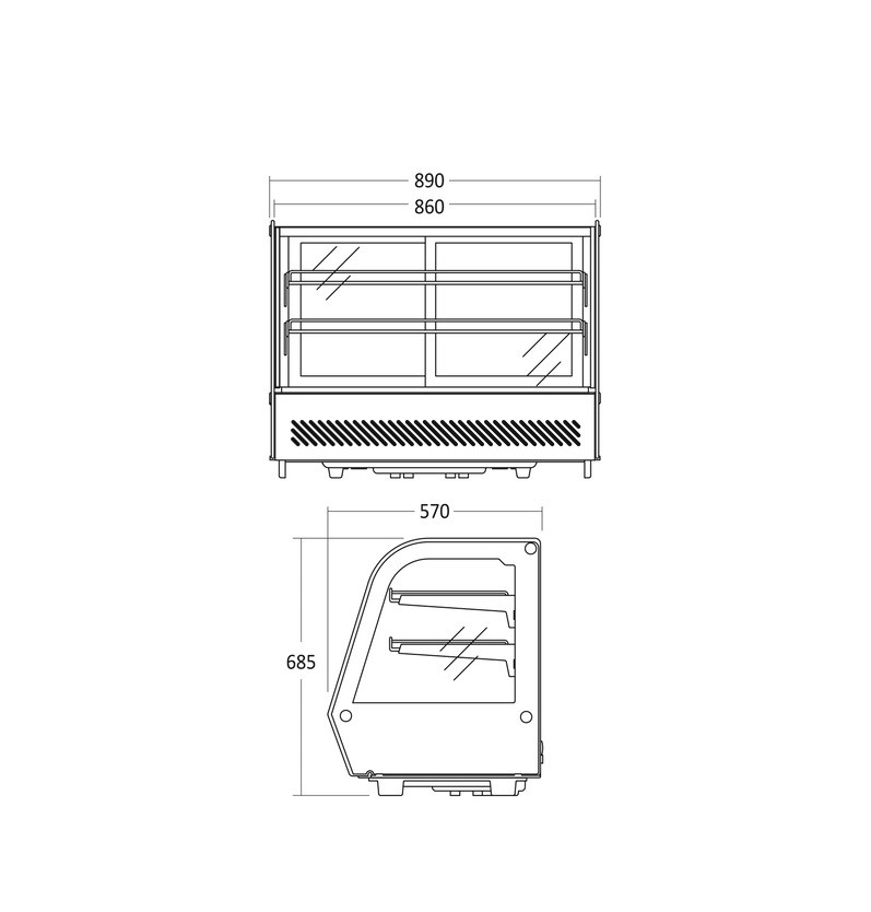 Vitrína má oblé čelní sklo a rovné skleněné bočnice. Přístup do vitrínky ze strany obsluhy skrze posuvná dvířka. Vnitřní prostor je osvětlen LED pásky. Šetrné oběhové chlazení (chlazení s ventilátorem), které zajišťuje rovnoměrnou teplotu v chlazeném prostoru. Vnitřní prostor je vybaven výškově nastavitelnou policí. Vitrína je vhodná do provozů s omezeným prostorem.