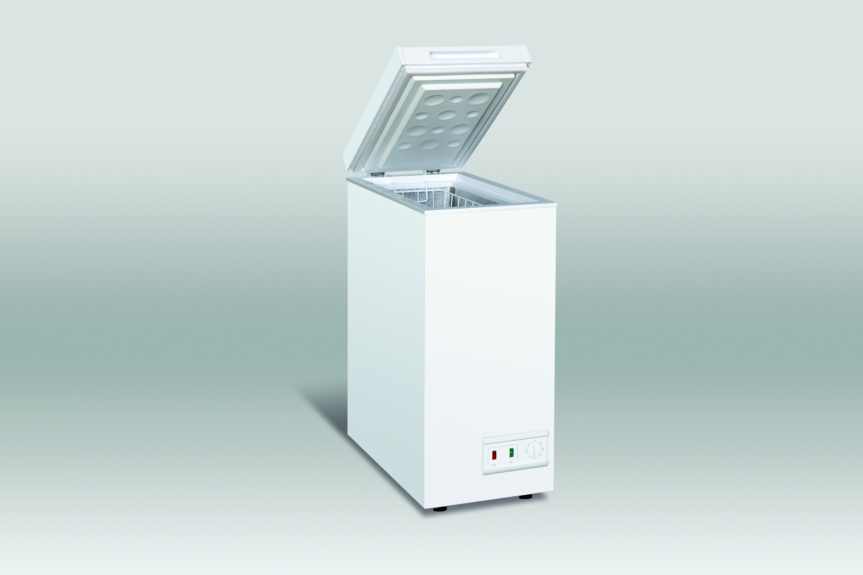 Bílá mrazicí truhla Scandomestic SB 60 W s plným odklopným víkem a jedním košem nabízí skladovací kapacitu 51l. Tento typ nahradil starší provedení SB 60 A+.