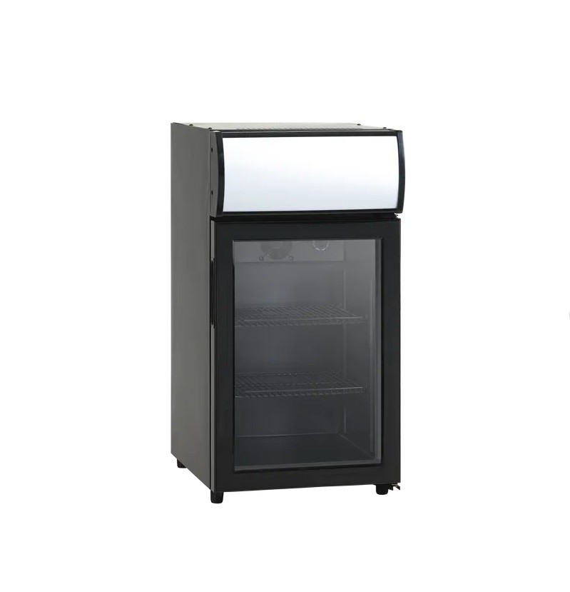 Barová chladnička Scandomestic SC 51 BE na plachovky se světelnou nástavbou o objemu 59l.