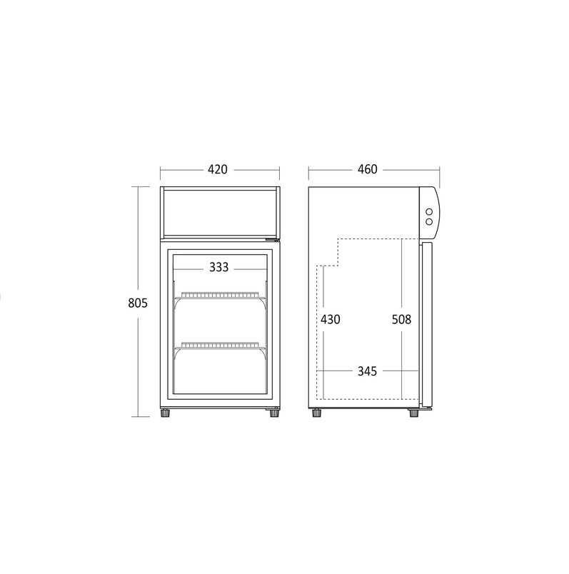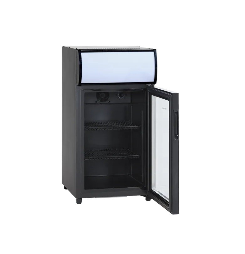 Chladnička má samozavírací skleněné křídlové dveře s integrovaným madlem, 2 nastavitelné potažené drátěné police a vnitřní LED osvětlení. Celočerná barová chladnička má světelnou nástavbu a spínač zapnutí a vyputí kabiny a vnitřního osvětlení. Nechybí čtyři nastavitelné nohy pro bezproblémový uklid pod spotřebičem. Typ chladiva R600a.