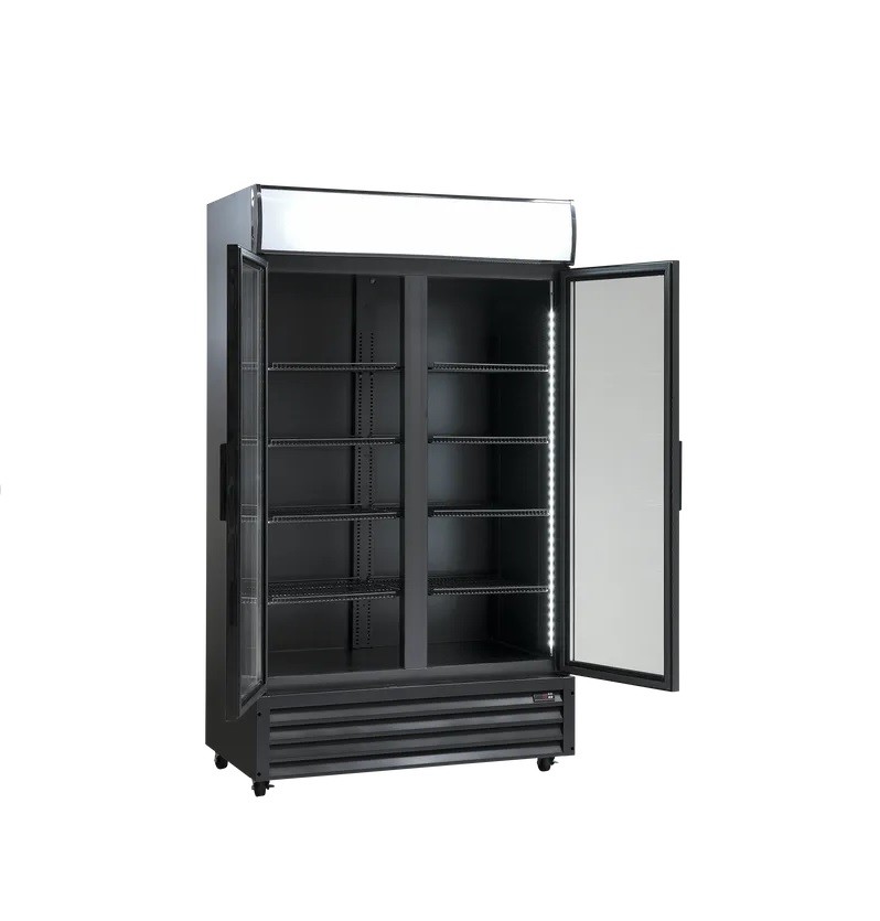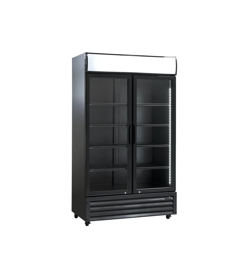 Výstavní nápojová chladnička černé barvy Scandomestic SD 1002 BHE se světelným reklamním panelem o vnitřním objemu 879l.