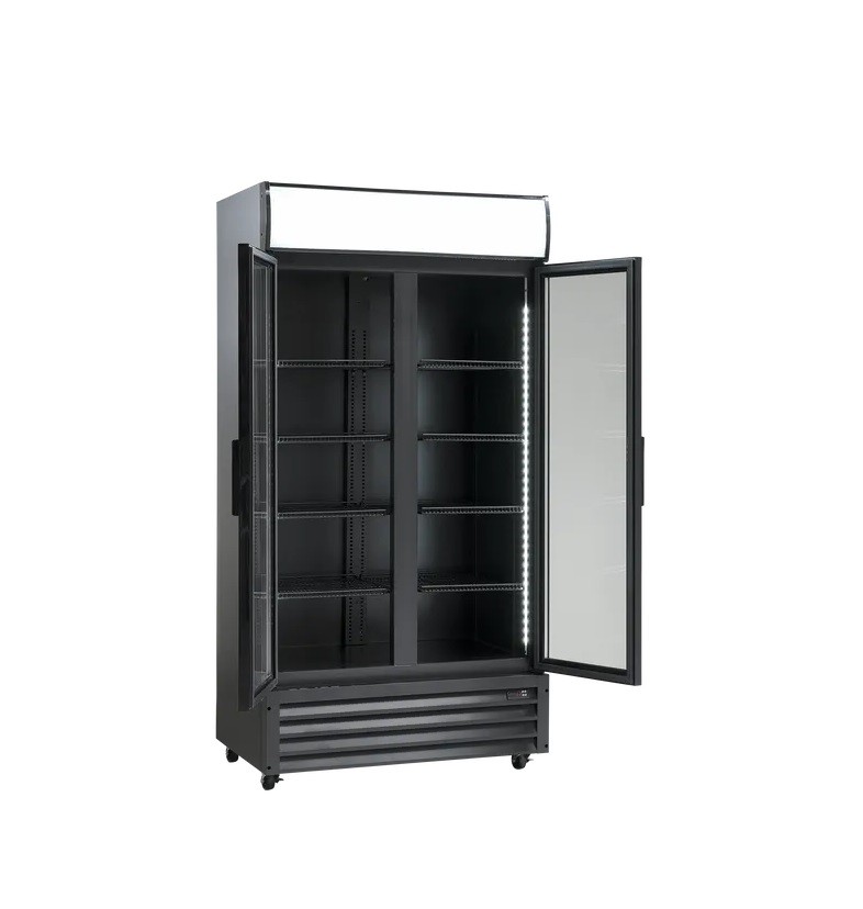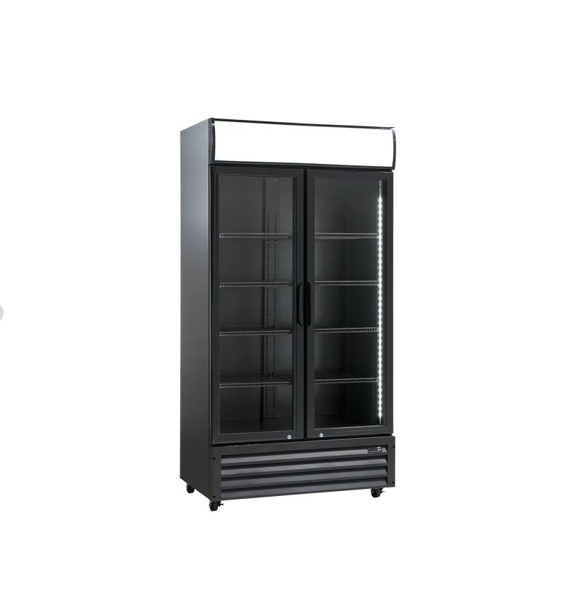 Výstavní nápojová černá chladnička Scandomestic SD 802 BHE se světelným reklamním panelem o vnitřním objemu 776l.