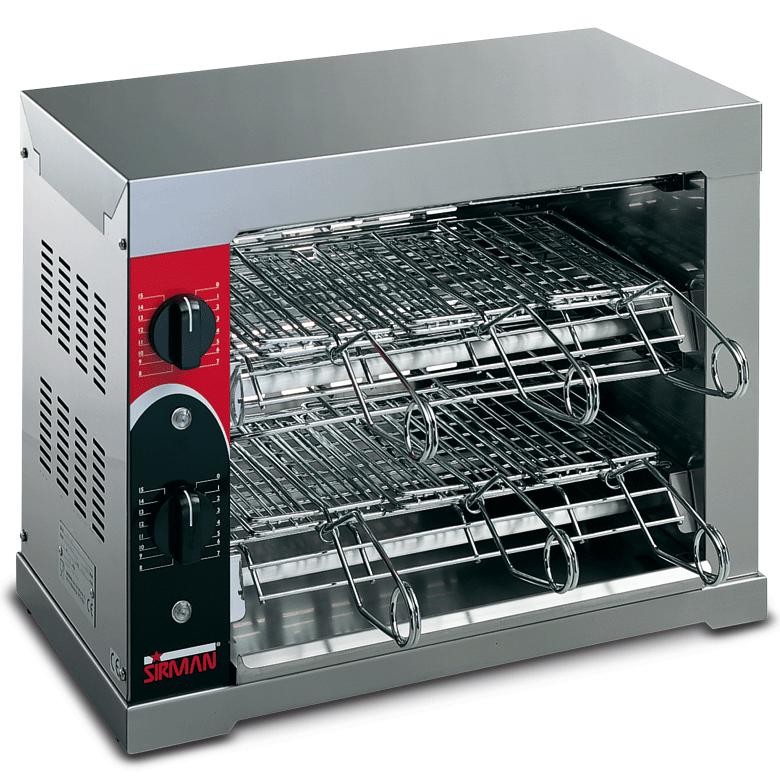 Profesionální toaster Sirman 12Q. Tělo toasteru je vyrobeno kompletně z nerezové oceli. Drátěné rošty mají povrch s chromové úpravě. Ve spodní části se nachází vyjmutelná zachytávací nádobka na drobky. Ohřev zajišťují kvalitní quartzové trubicce. Toaster je schopen naráz opékat až 12 toastů.