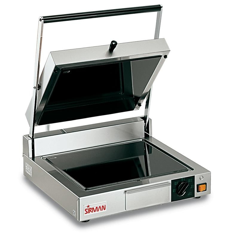 Profesionální kontaktní gril Sirman Cort V. Tělo je vyrobeno z nerezové oceli. Díky své  malé hmotnosti se s ním snadno manipuluje.Teplotu lze regulovat  od  0/ 300 °C. Tento využívá k ohřevu sklokeramické desky Ceran®. Desky se velice snadno čistí. Horní plát je odklápěcí. Vhodné pro rychlé dosažení požadované teploty. Přístroj má dále čtyři nastavitelné nožičky.
