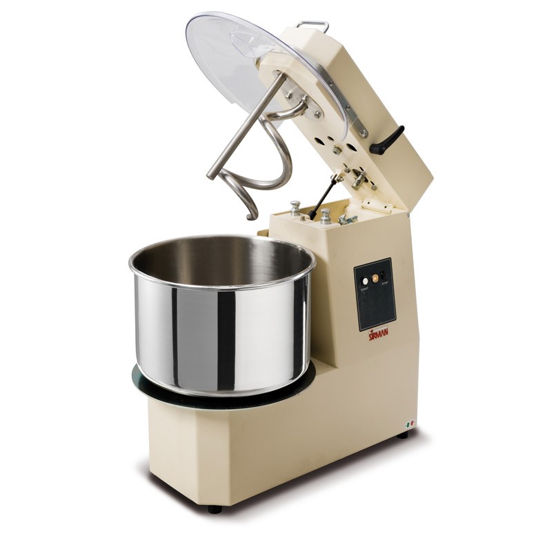 Spirálový hnětač těsta Sirman Hercules 20 TA. Tělo hnětače je vyrobeno z tlustostěné oceli C40 s povrchovou úpravu proti poškrábání. Vyjmutelná nádoba se otáčí okolo své osy rychlostí 10 otáček za minutu. Nádoba je vyrobena z nerezové oceli a má zesílený okraj. Nádoba má obsah 21 l a maximální hmotnost těsta uvnitř nádoby je 17 kg. Nádoba má ∅ 360 mm a výšku 210 mm. Standartně je stroj dodáván s odklopnou krytkou vyrobenou z plexiskla doplněnou o plnicí otvor. Spirála rotuje rychlostí 85 otáček za minutu. Hlava je odklopná. O pohon hnětače se stará výkonný motor s řetězovým převodem. Hnětač je vybaven teplotním čidlem. Kontrolní prvky mají stupeň krytí IP 67.
