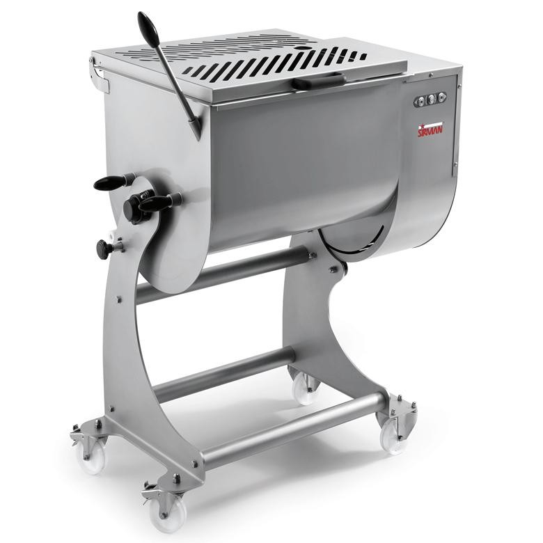 Profesionální míchačka masa Sirman IP 50 XP B/a. Tělo přístroje a veškeré součástky, které mají styk s masem, jsou vyrobeny z nerezové oceli AISI 304.