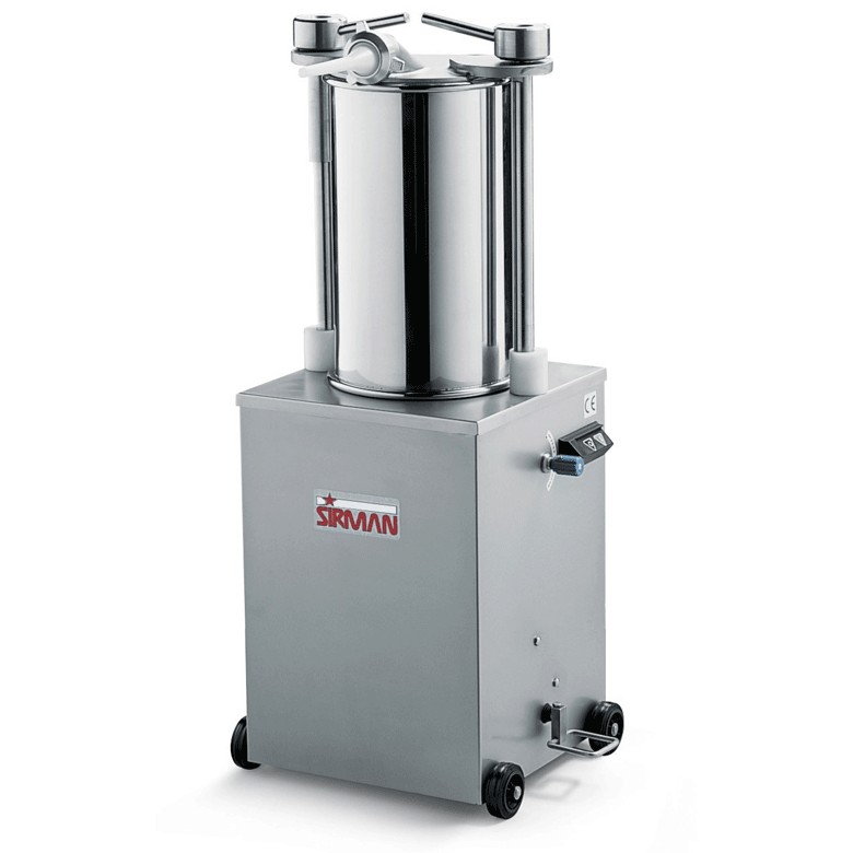 Profesionální vertikální plnička párku, klobás a jitrnic Sirman IS 25 Idra. Stroj jednoduchého designu je vyroben pouze z nerezové oceli. Plnička může být kompletně rozebrána bez použití nářadí. Válec je hermeticky uzavřen. Píst je vyroben z nerezové oceli a je vybeven silikonovým těsněním. Píst disponuje automatickou funkcí pro návrat pístu při zastavení motoru. Standartně je plnička dodávaná se třemi plnicími nástavci z nylonu o průměrech 10 mm, 18 mm a 25 mm. Obsah válce je 25 l.