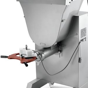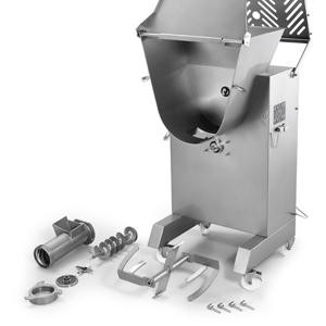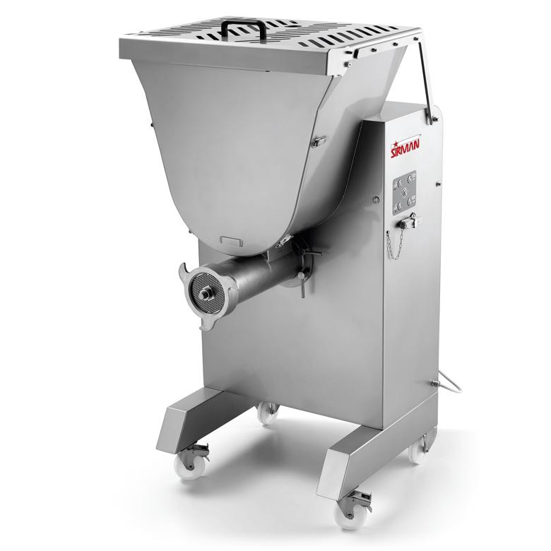 Profesionální mlýnek na maso a míchačka masa Sirman Master 90 Y12 HP 7. Stroj je designován pro maximální efektivitu práce. Masivní konstrukce na kolečkách je celá z nerezové oceli. Hlava a vnitřní komponenty jsou též z nerezové oceli. Hlavu i vnitřní komponenty lze snadno demontovat bez použití nářadí. Stroj funguje perfektně i v případě, že je produkt zpracováván více než 2x. Stroj má dva nezávisle motory pro míchačku a mlýnek.Vzduchový píst pro asistované otevírání víka. Stroj má vodotěsnou převodovku v olejové lázní. Standartně dodávaná šajba má průměr 4,5mm. Stupeň krytí IP 67. Hodinová produkce dosahuje až 1200 kg. Tento mlýnek se hodí do nepřetržitého provozu.