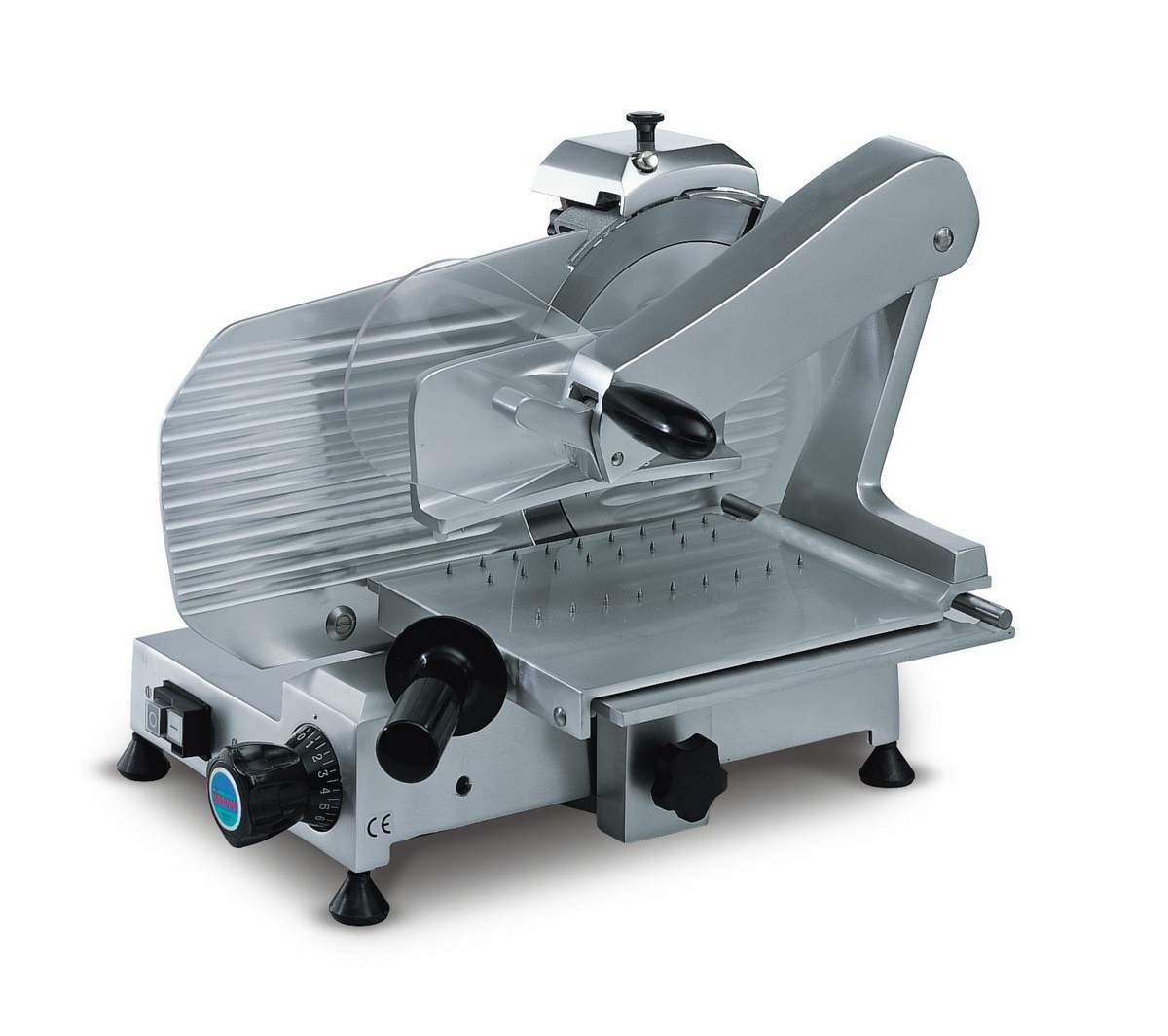 Nářezový stroj Mirra 250 C Vert. BS, určen do nepřetržitého provozu, je vyroben z hliníkové slitiny se šrouby z nerezové oceli a má ventilátorem chlazený motor. Tato verze je vybavena specialním ramenem z nerezové oceli pro zpracování masných výrobků. Stroj je vybaven nožem z kované tvrzené oceli se zabudovaným brusným zařízením a deflektorem pro skládní plátků. Tento nářezový stroj je menších rozměrů, ale poskytuje velký výkon. Dostatečná vzdálenost mezi motorem a čepelí nože a lehce odnímatelný pojezd je zárukou snadného čistění a nabízí dostatek místa pro nakrájené plátky. Verze Mirra má plastový otočný knoflík nastavující tloušťku řezu, gumové nožičky, plastová tlačítka bezpečnostní třídy IP 44 a ochranný kryt motoru. Průměr nože - 250 mm Maximální tloušťka řezu - 13 mm