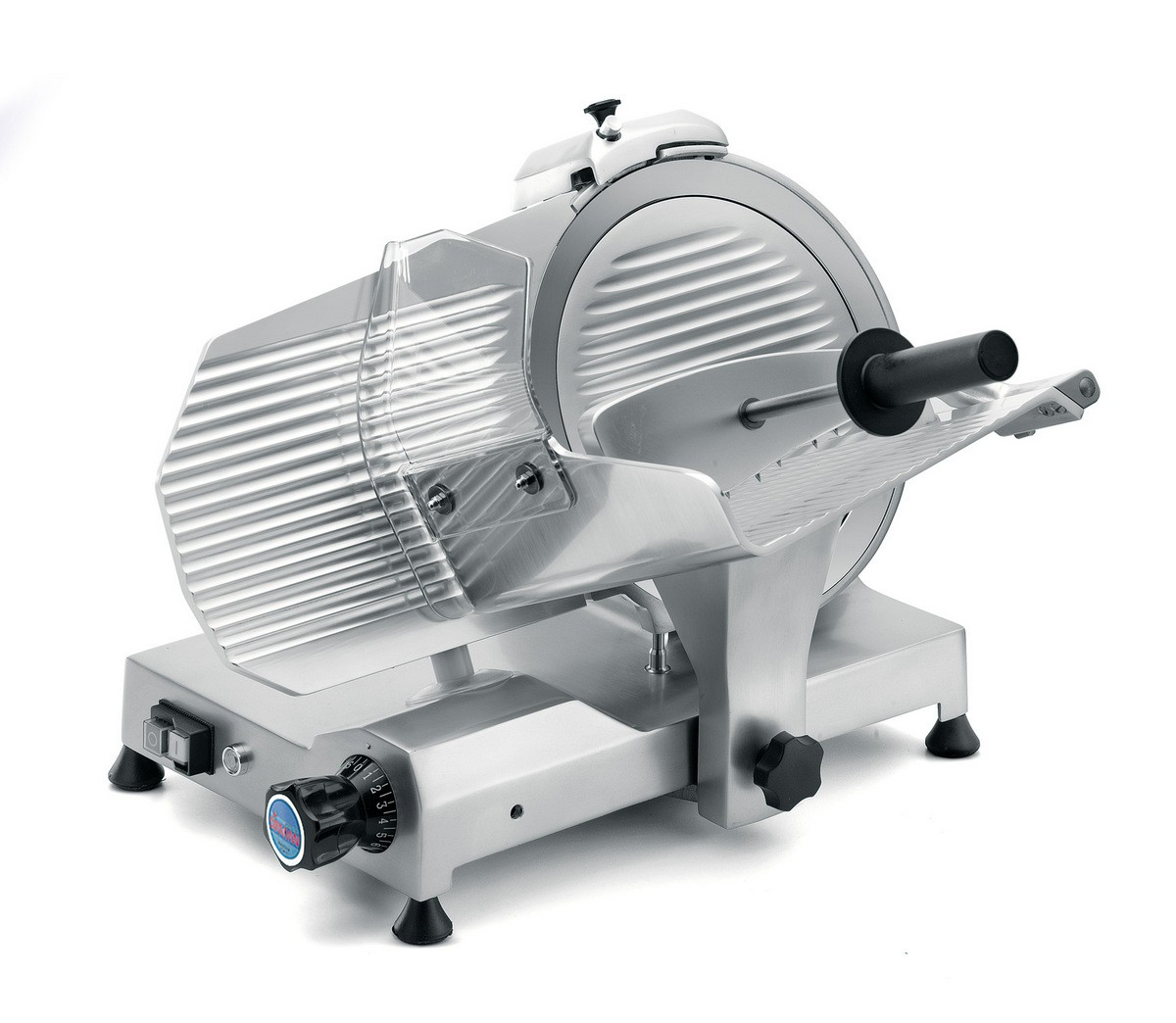 Nářezový stroj Mirra 300 Y09, určený do středního provozu, je vyroben z anodizované hliníkové slitiny, má ventilátorem chlazený motor, ochranný kryt kráječe, velký kotoučový nůž se sklonem 25°, který je vybaven zabudovaným brusným systémem a snímatelný deflektor pro skládání plátků. Kluzné plochy pojezdu jsou automaticky promazávány. Velká vzdálenost mezi motorem a čepelí nože a lehce odnímatelný pojezd je zárukou snadného čistění a nabízí dostatek místa pro nakrájené plátky. Verze Mirra má plastový otočný knoflík nastavující tloušťku řezu, gumové nožičky, plastová tlačítka bezpečnostní třídy IP 44 a ochranný kryt motoru. Možnost doobjednání teflonových nebo ozubených nožů. Průměr nože - 300mm Maximální tloušťka řezu - 13mm