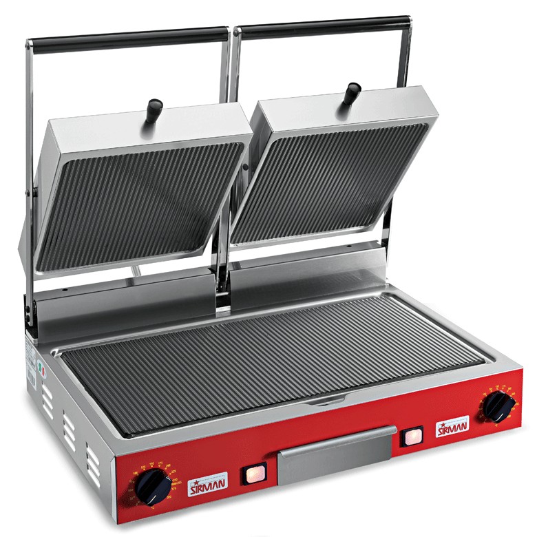 Profesionální kontaktní gril Sirman PD Vc. Tělo je grilu je vyrobeno kompletně z nerezové oceli. Teplotu lze regulovat v rozmezí 0 až 300°C.Gril využívá k ohřevu sklokeramické desky z materiálu Ceran®. Desky z Ceranu se velice snadno čistí a vynikají rychlým dosažením požadované teploty. Gril je rozdělen na dvě poloviny. Každá polovina má vlastní ovládání teploty a v případě verze Timer i časovač. Obě poloviny jsou schopné pracovat nezávisle na sobě.