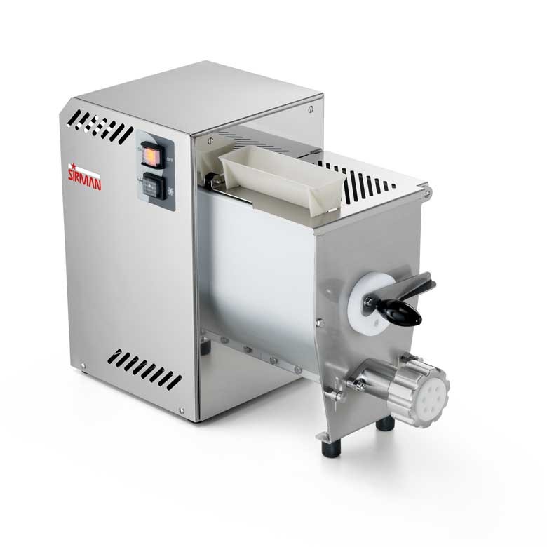 Profesionální výrobník tlačených těstovin s hnětačem těsta Sirman Concerto. Výrobník má celonerezovou konstrukci z potravinářské oceli AISI 304. Ventilovaný motor s převodovkou v olejové lázni. Výrobník se vyznačuje snadnou obsluhou a údržbou. Nádoba na těsto má obsah 6l a maximální hmotnost těsta je 2,5kg. Matrice mají ø59 mm a jsou vyrobeny z bronzu. Standartně je výrobník dodáván s nerezovou krytkou nádoby. Kryt je opatřen otvorem pro přidání tekutých ingrediencí přímo za chodu.