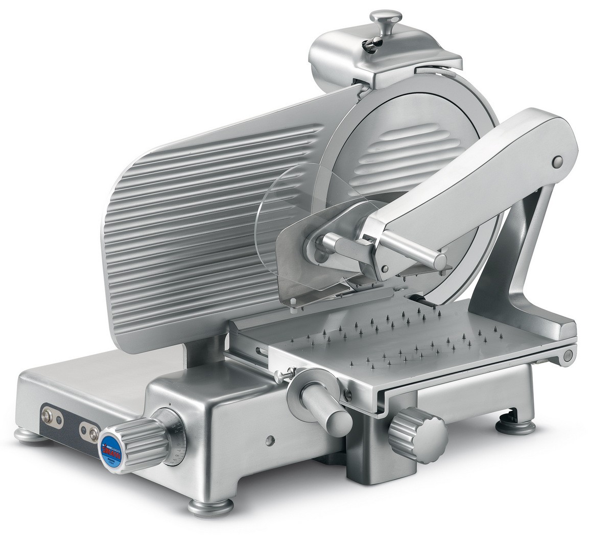 Nářezový stroj Tiziano 350 BS Top, určen do nepřetržitého provozu, má inovativní oblý design bez ostrých hran a viditelných šroubů. Tato verze je vybavena specialním ramenem z nerezové oceli pro zpracování masných výrobků. Stroj má vulkanizované gumové dorazy na podavači a nerezový deflektor pro skládání nakrájených plátků. Kluzná tyč podavače a její uložení má lapovaný povrch, pro hladký pohyb. Stroj má uzavřený a utěsněný řemenový pohon a zabudované brusné zařízení. Pro snadné čištění je vzdálenost mezi motorem a nožem 48mm. Verze Tiziano BS Top je dodávána s hliníkovým otočným knoflíkem pro nastavení tloušťky řezu, hliníkovými teleskopickými nožičkami s protiskluzovou gumou a hliníkovými tlačítky bezpečnostní třídy IP67. K tomuto nářezovému stroji se navíc dodává sada nářadí pro údržbu. Možnost dodat v 230V nebo 380V zapojení. Průměr nože - 350mm Maximální tloušťka řezu - 29mm