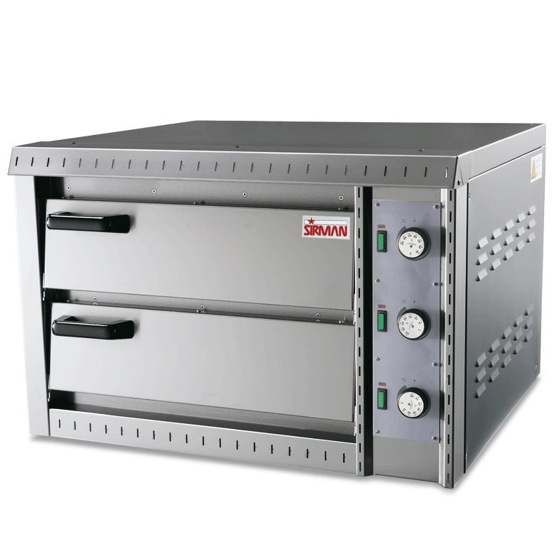 Profesionální dvojúrovňová pec na pizzu Sirman Vulcano. Pec je vyrobena z nerezové oceli. Vnitřní rozměry trouby jsou 500x520x115 mm. Pizza se peče na žáruvzdorné kamenné desce. Deska rovnoměrně distribuuje teplo, to zaručí vždy rovnoměrné propečení. Trouba disponuje trojicíjící topných těles. Topná tělesa jsou odolná proti poškození. Topná tělesa lze zapnout nezávisle na sobě. Do každé úrovně trouby se vejdou 2 pizzy ø ≤ 300 mm nebo 1 pizza ø ≤ 500 mm. Teplotu pece lze regulovat v rozmezí 50 až 450 °C. Možnost dodat v jednofázovém (230V) nebo třífázovém (400V) provedení.