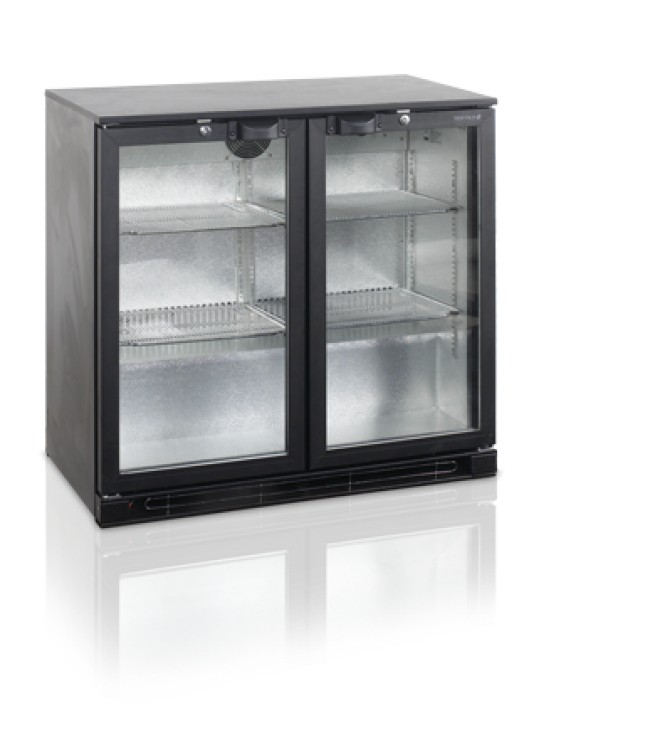 Prosklená podbarová chladnička černé barvy s hliníkovým interiérem nabízí skladovací kapacitu 191l. Má 2 křídlové dveře s dvojitým zasklením, 4 výškově nastavitelné nožičky zajišťující snadnou dostupnost při úklidu pod chladničkou a zámek pro bezpečné uskladnění zásob. Vnitřní prostor je osvětlen LED páskem, který usnadní orientaci a zlepší viditelnost skladovaných produktů. Standardně je vitrína vybavena 4 nastavitelnými policemi, funkcí automatického odtávání a elektrickým termostatem.
