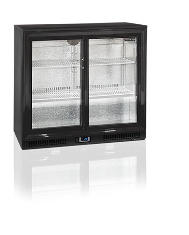 Výstavní nápojová chladicí vitrína Tefcold DB200S černé barvy má 2 posuvné dveře s dvojitým sklem. Nápojová chladnička nabízí skladovací kapacitu 191l.