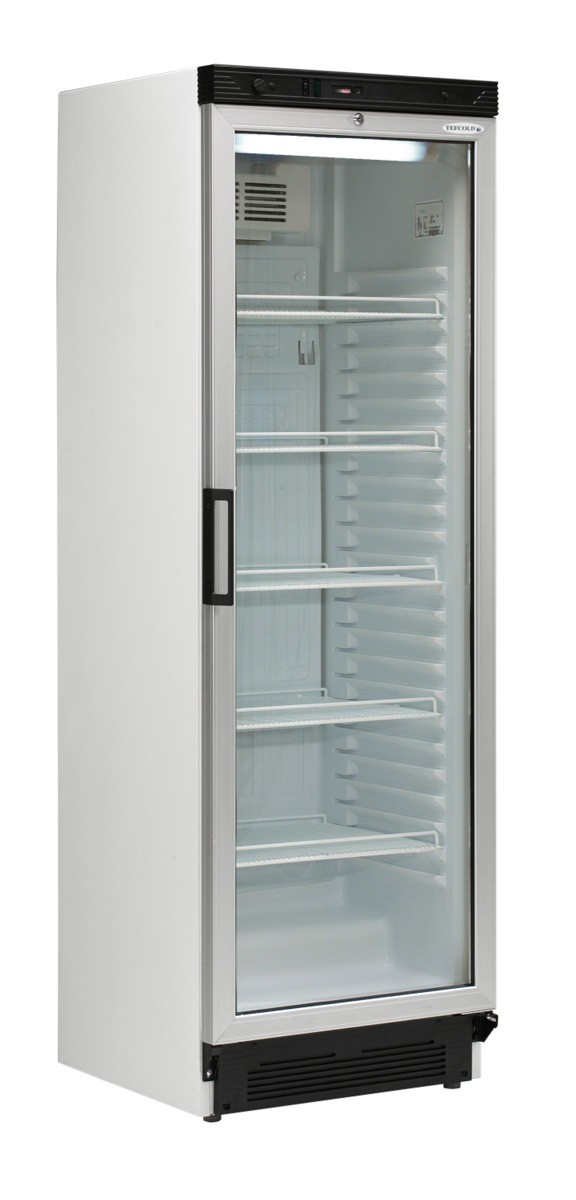 Profesionální model chladicí skříně na lahve Tefcold FS1380 v bílém provedení s prosklenými dveřmi a ventilovaným chlazením.