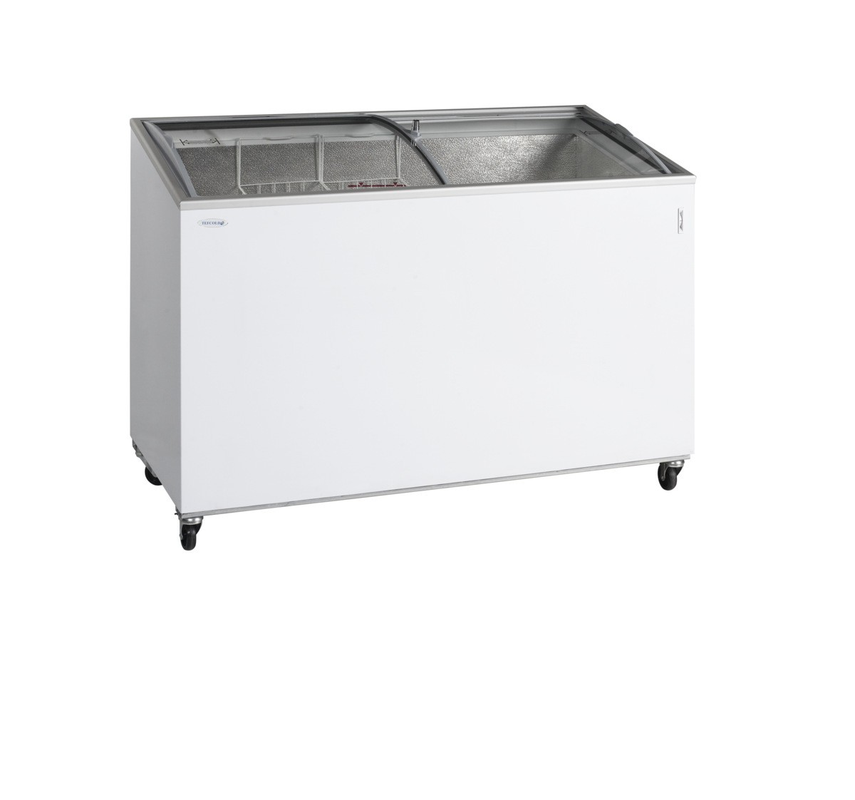 Profesionální šikmá mrazicí truhla o objemu 325 l určena pro skladování a prezentaci nanuků a zmrzlin, která je vhodná pro všechny gastronomické provozy. Truhla má 2 prosklená posuvná oblá víka, ABS interiér, 2 bílé koš, 4 odolná kolečka (2 kolečka s brzdou), teploměr, mechanický termostat a zámek. Typ chladiva je R290.