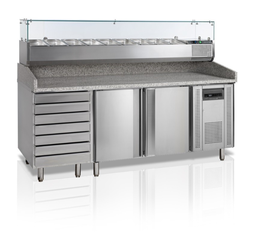 Chladicí nerezový stůl Tefcold PT1310+VK38-200 s nástavbou o objemu 390l s nerezovým interiérem zejména vhodným k přípravě pizzy.