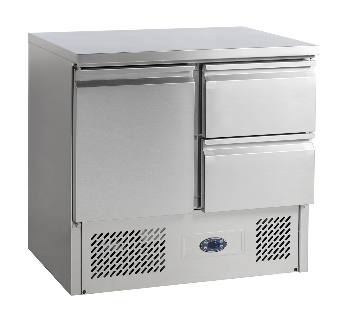 Stůl je vybaven 1 samozavíracími plnými dveřmi, 2 šuplíky, 1 poličkou, automatickým odtáváním, 4 nastavitelnými nožičkami a kontrolním panelem pro snadnou regulaci teploty.