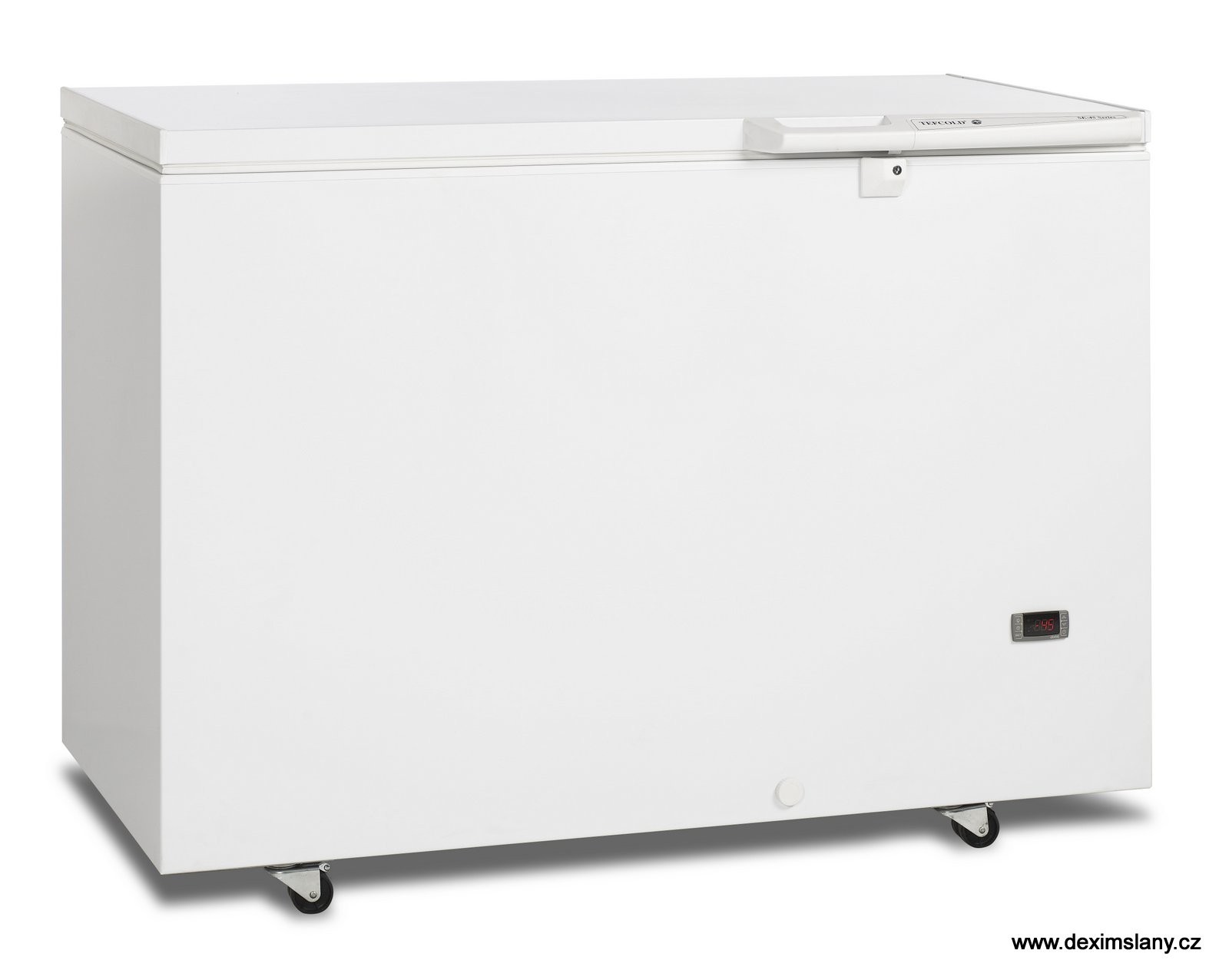 Mrazící truhla bílé barvy s hliníkovým interiérem nabízí skladovací kapacitu 330l. Spotřebič má plné odklopné víko a nejnižší mrazící teplotou -45° Celsia. Čtyři kolečka zajišťují bezproblémovou manipulaci. Mrazák dále disponuje zabudovaným zámkem, 1 košem, elektronickým termostatem s alarmem a odkapovou miskou na kondenzát.