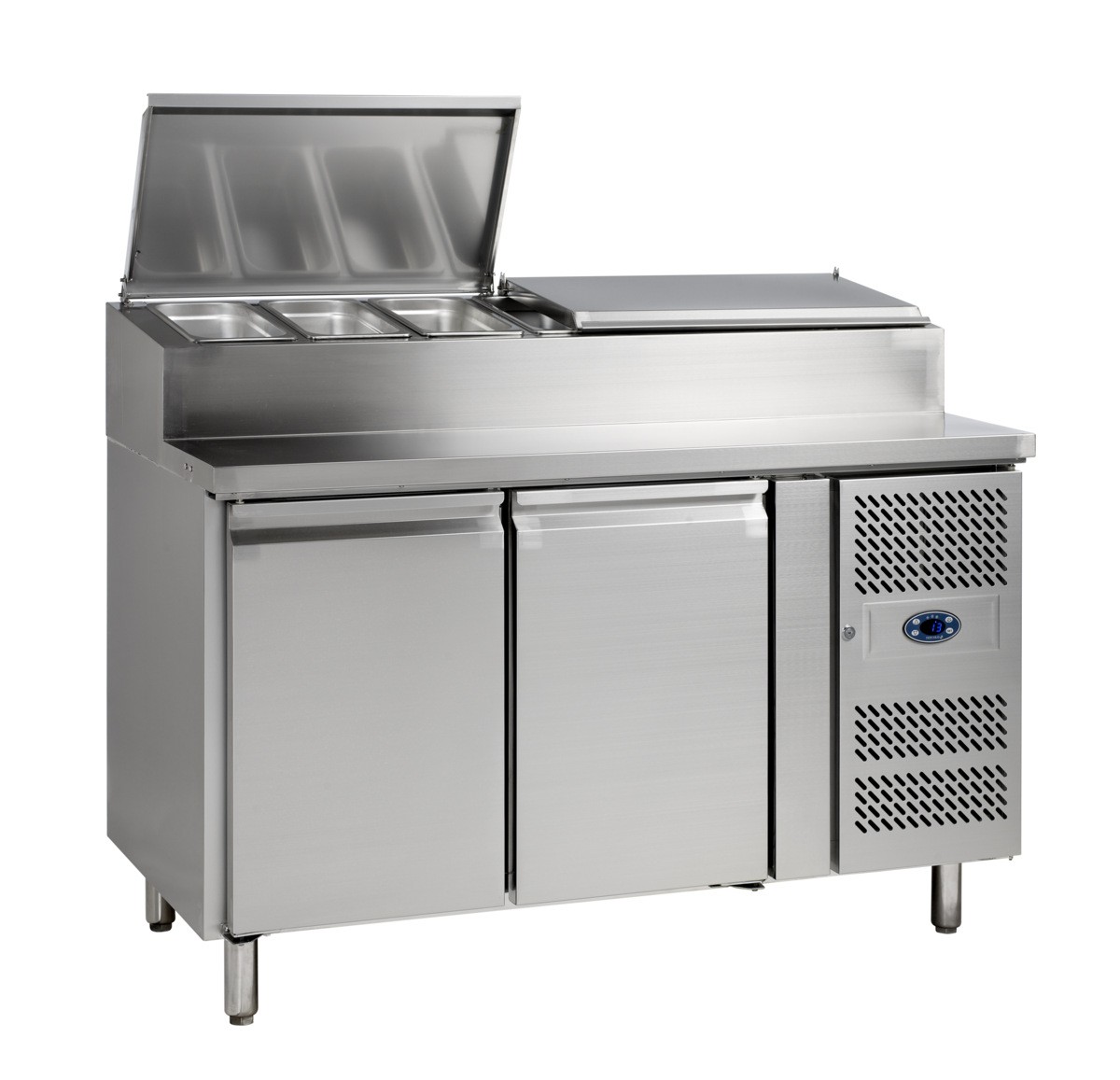 Stůl je vybaven 2 samozavíracími plnými dveřmi, 2 policemi, chlazenými vaničkami na polevy, automatickým odtáváním, 4 nastavitelnými nožičkami a má kontrolní panel pro snadné nastavení teploty.