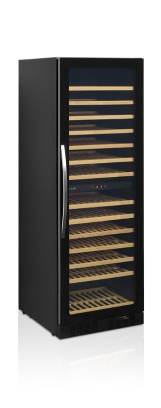 Vinotéka celočerné barvy Tefcold TFW400-2F se dvěmi chlazenými zónami nabízí skladovací kapacitu 416l.