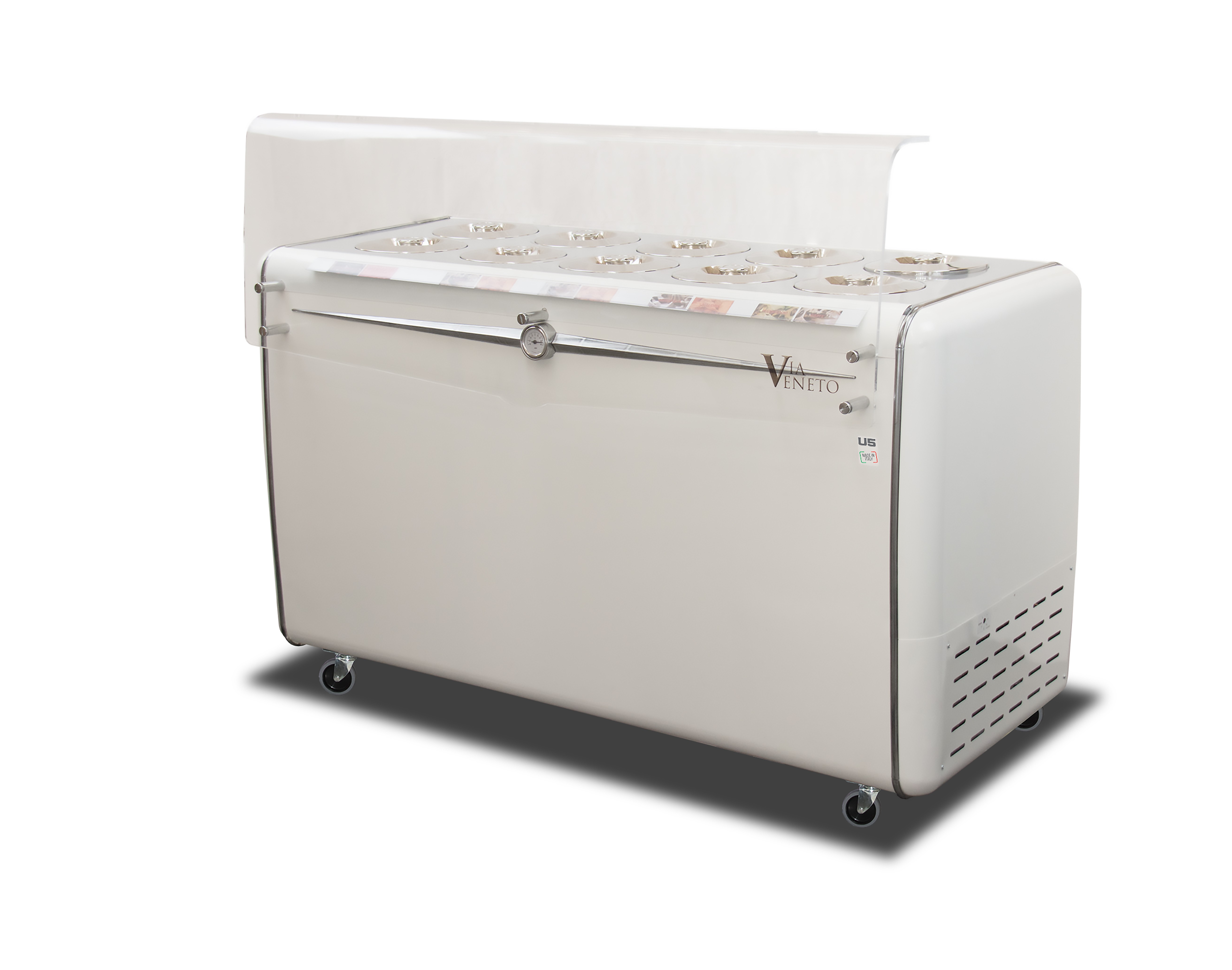 Profesionální výdejník na kopečkovou zmrzlinu uzpůsobený k použití tradičních kulatých nádob Pozzetti. Výdejník je dodaván v bílé barvě. Výdejník pojme 8 nádob Pozzetti (7,5l) + 6 jako zásobu. Výdejník je vybaven 4 kolečky, které usnadňují jeho transport.