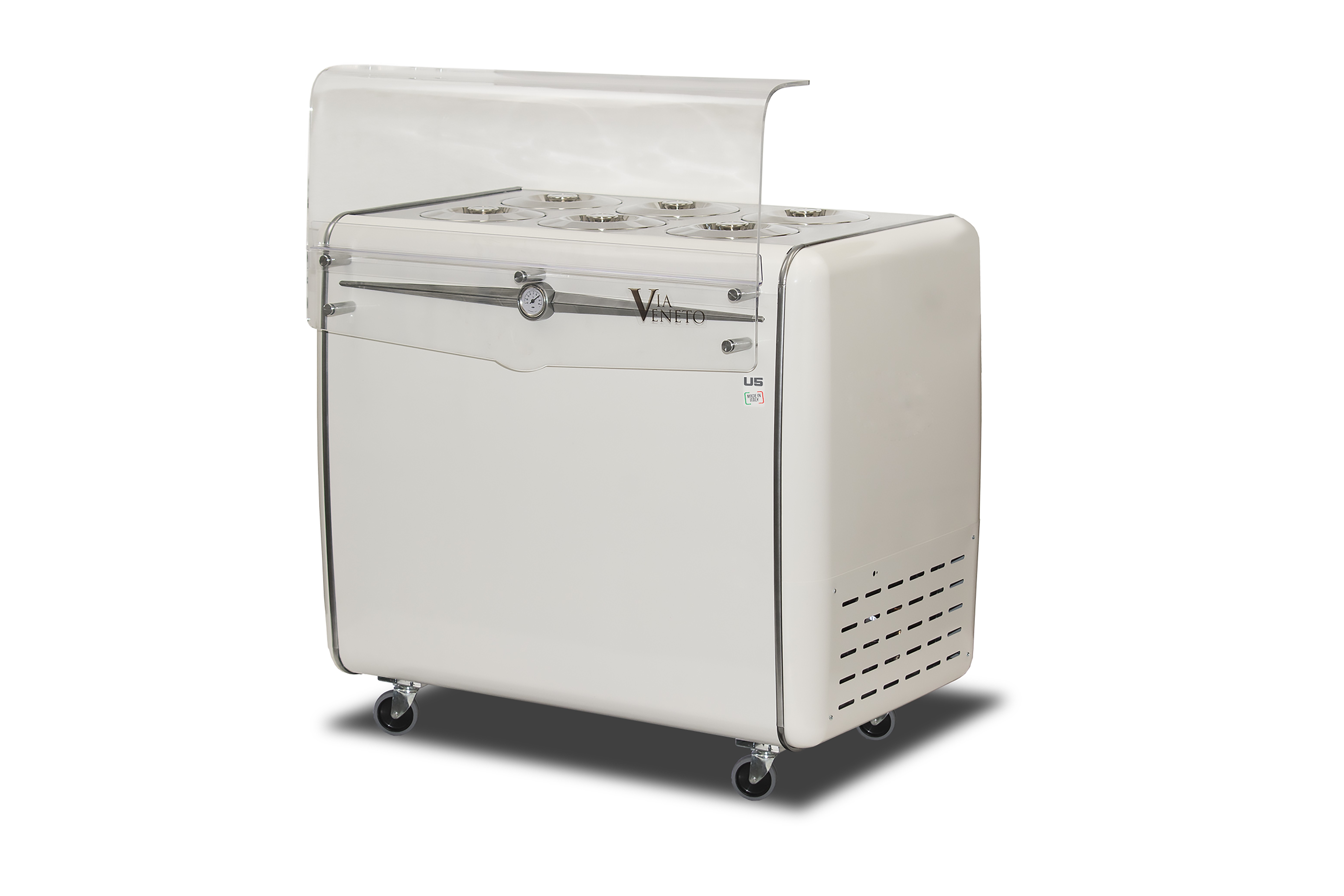 Profesionální výdejník na kopečkovou zmrzlinu uzpůsobený k použití tradičních kulatých nádob Pozzetti. Výdejník je dodaván v bílé barvě. Výdejník pojme 6 nádob Pozzetti (7,5l) + 4 jako zásobu. Výdejník je vybaven 4 kolečky, které usnadňují jeho transport.